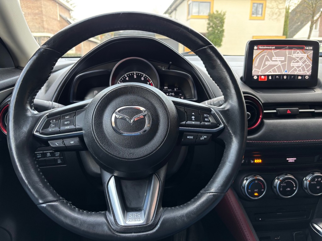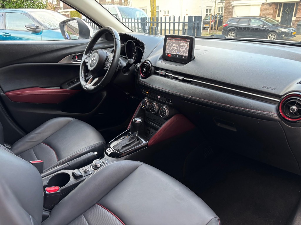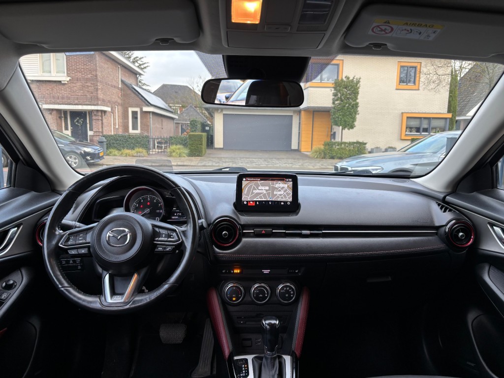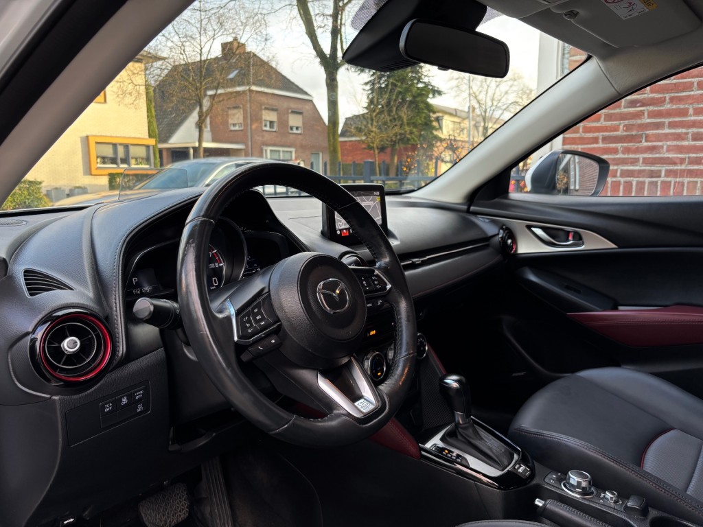 Mazda CX-3, GT-M uitvoering, 4-2018, 142.000km, 120pk, automaat, LED dagrijverlichting, xenon verlichting, privacy glas, parkeersensoren achter, keyless entry / keyless go, afneembare trekhaak, mistlampen voor, achteruitrij camera, 18 inch lichtmetalen velgen, lederen stuurwiel met radiobediening, lederen bekleding, stoelen voor in hoogte verstelbaar, ISOFIX, elektrische ramen voor en achter, elektrische spiegels inklapbaar, Bose geluidsinstallatie, navigatie, cruise control adaptief, bluetooth, USB / AUX aansluiting, head up display, licht en regensensor, airco, stoelverwarming voor, stuurverwarming, boordcomputer.